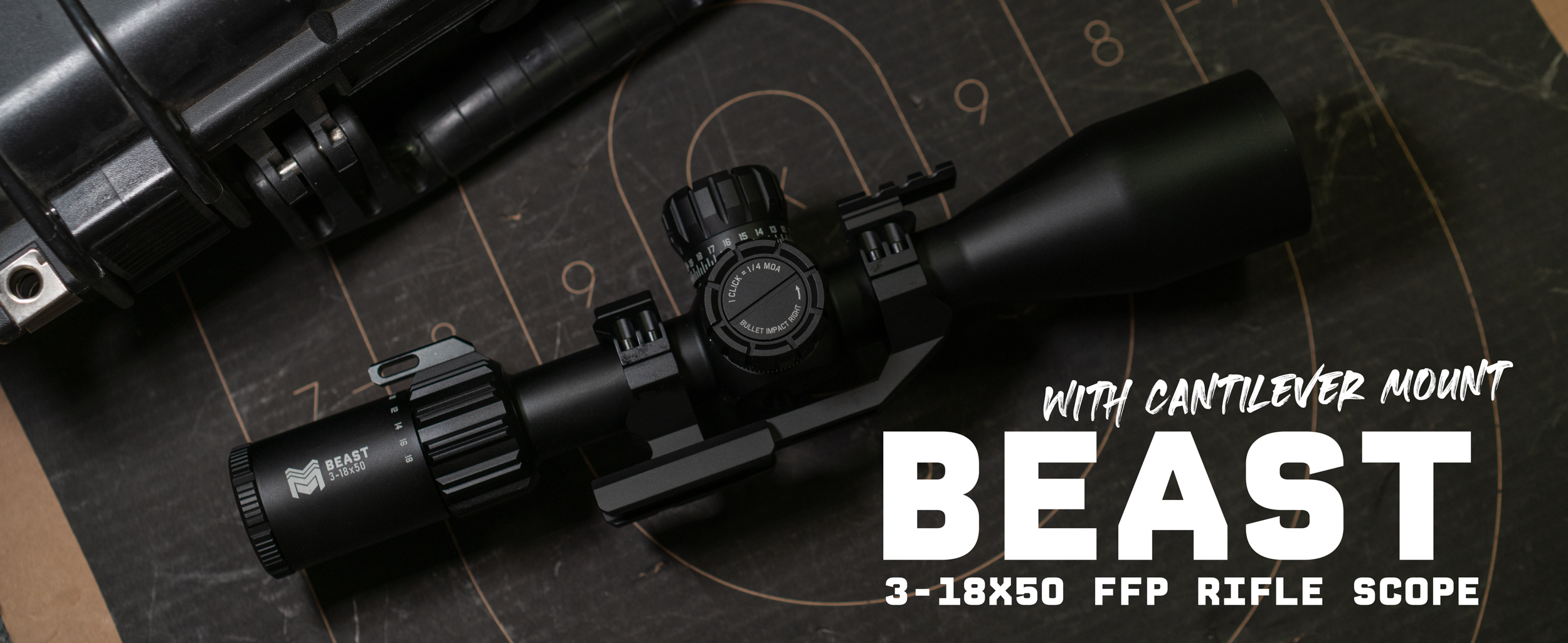 | Included: | 3-18X50 FFP Scope, Bikini style covers, 30mm Cantilever Scope Mount, 1 3V CR2032 Battery, Torx Wrench, Lens Cloth |