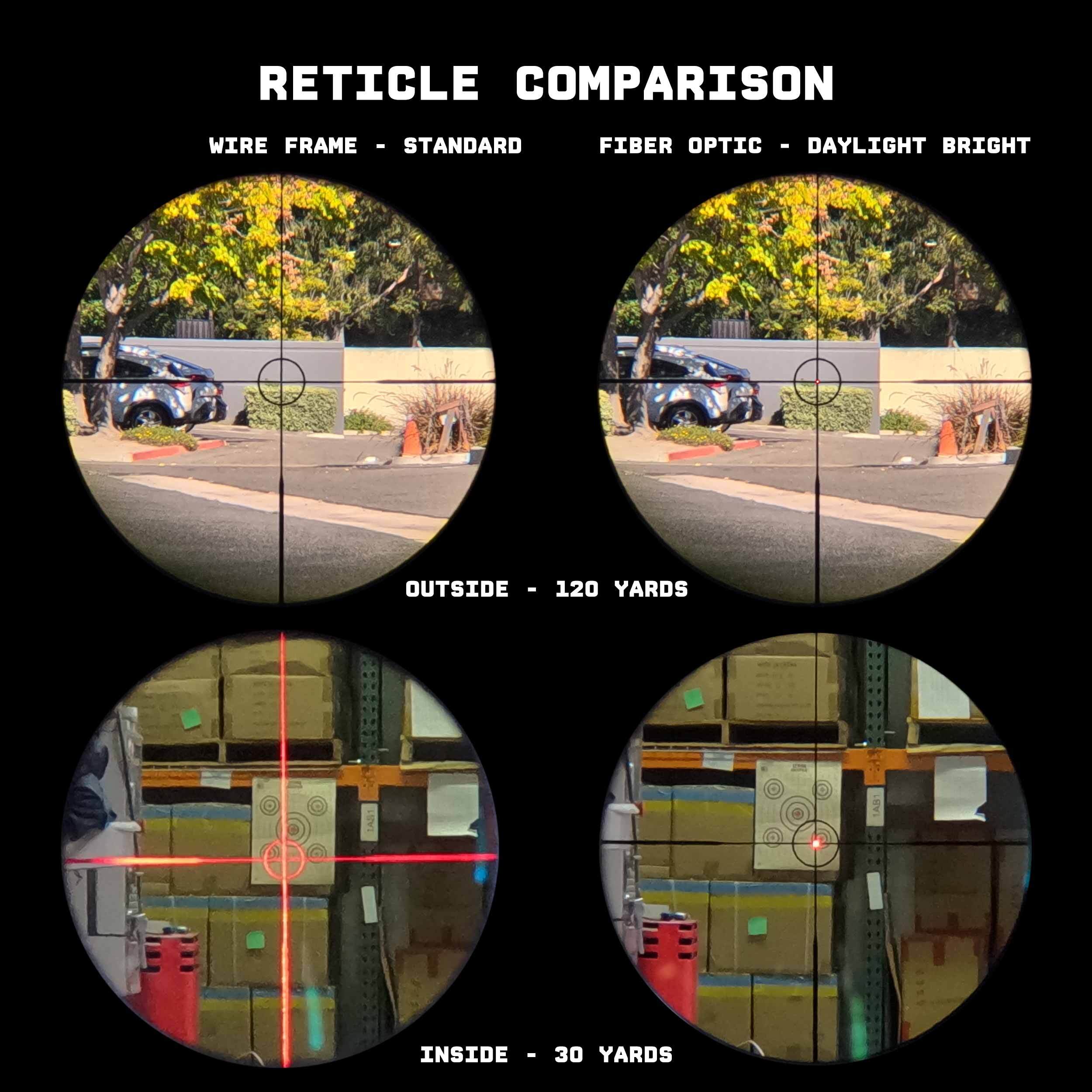 Fiber optic reticles differ from traditional etched or wire reticles in that the light source is channeled through a fiber optic filament to the center of the reticle to produce a daylight bright center dot, similar to that of a red dot.