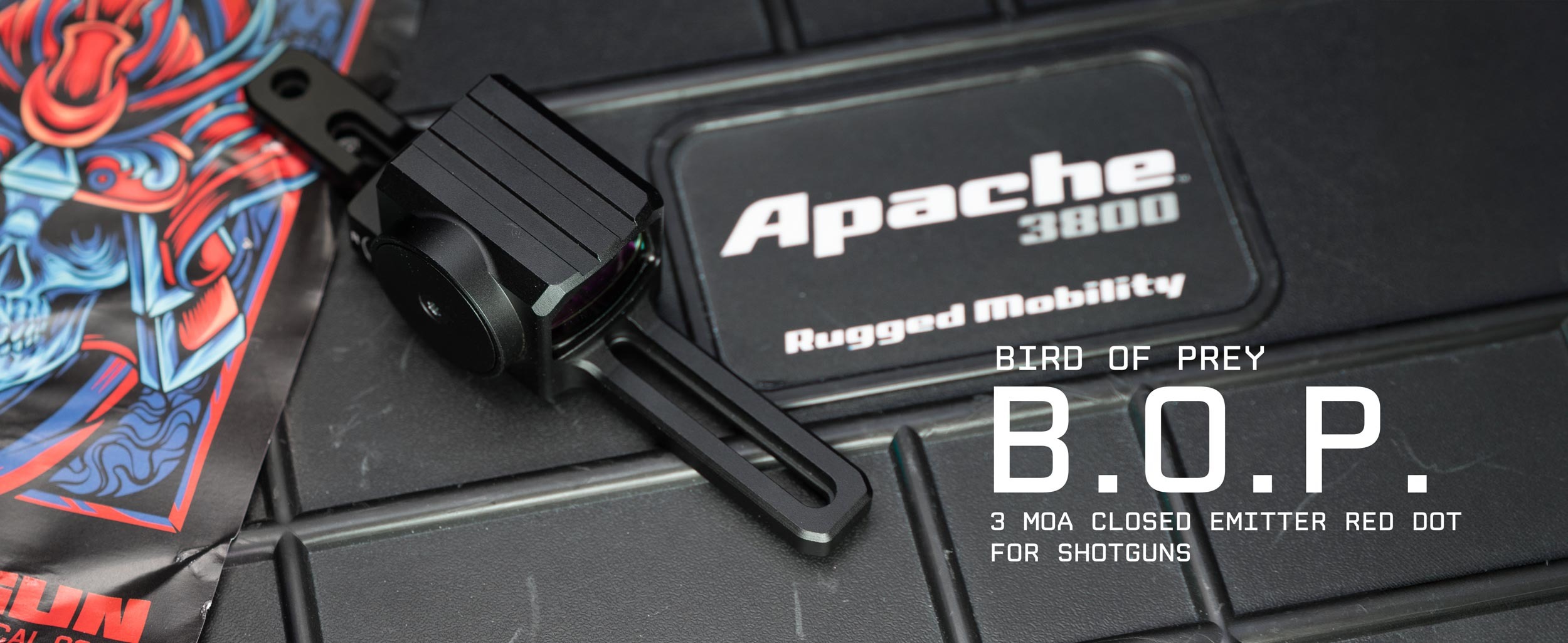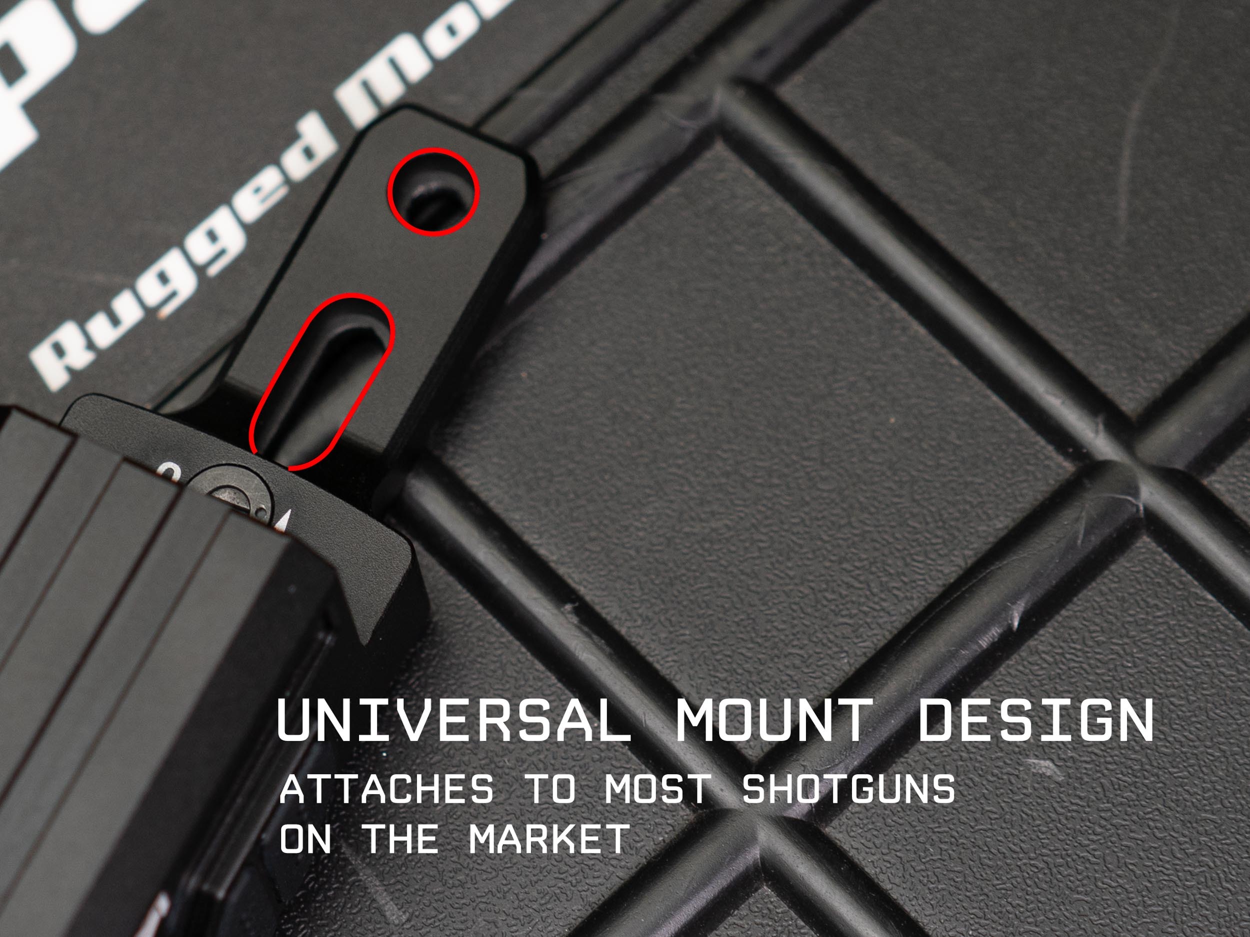The shotgun version comes attached to a fixed universal shotgun mount compatible with most popular drilled and tapped shotgun models.
