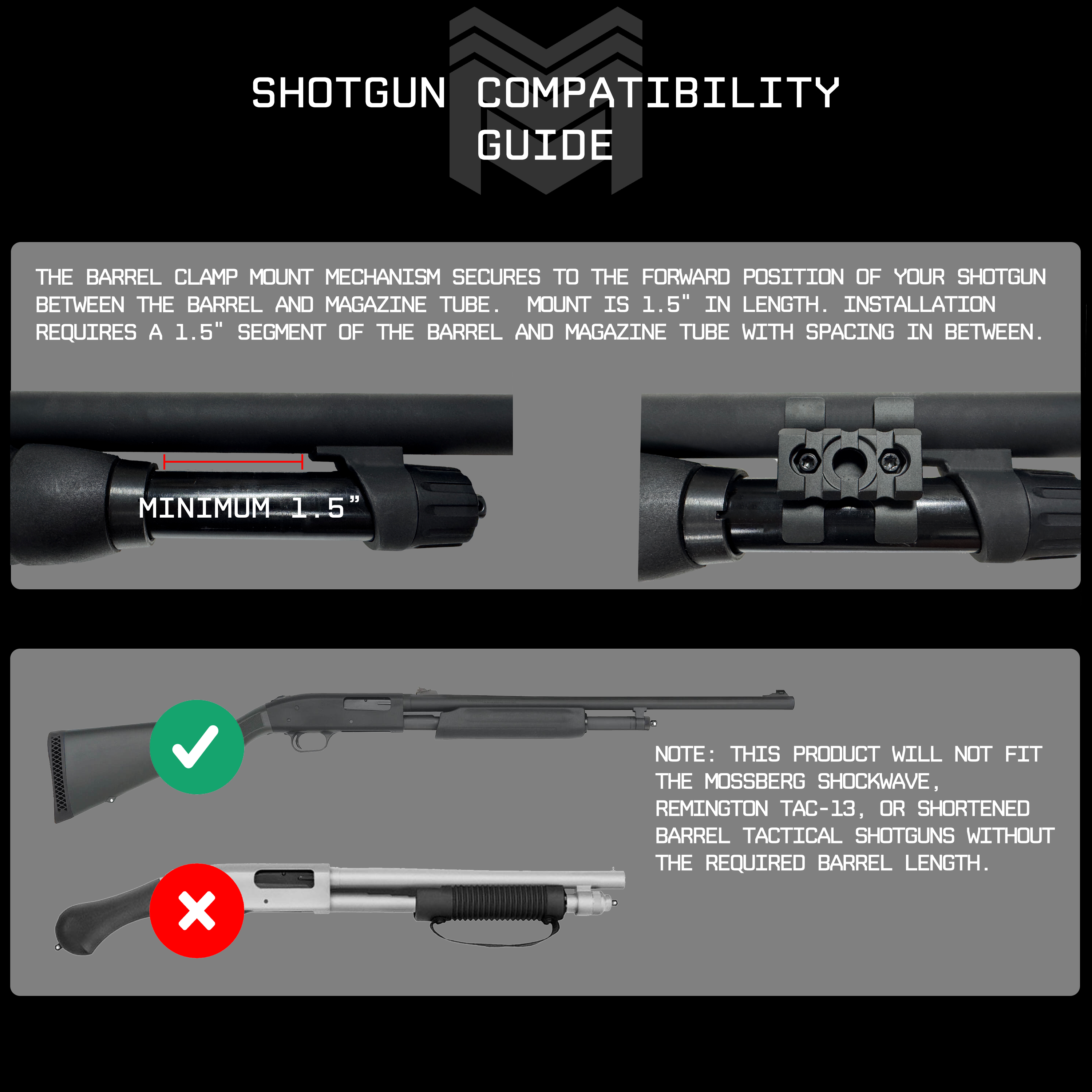 The barrel clamp mount mechanism secures to the forward position of your shotgun between the barrel and magazine tube. Mount is 1.6 inches in length. Installation requires a 1.6" segment of the barrel and magazine tube with spacing in between. Includes adhesive foam pad spacers for fitment to a variety of makes and models while protecting the finish of your shotgun. Note that this product will not fit the Mossberg Shockwave or shortened barrel tactical shotguns without the required barrel length.